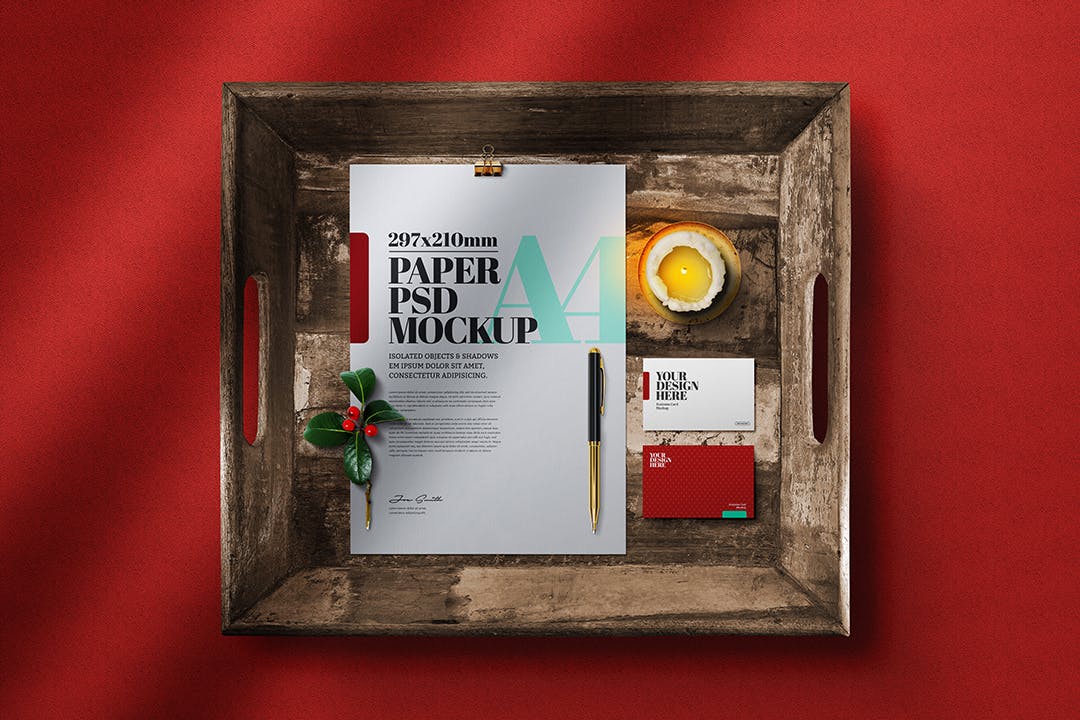 该仿古木制元素圣诞文具A4海报样机将帮助您改善演示文稿或任何其他项目。在这里您可以找到高质量的图像,以高分辨率拍摄。所有对象、灯光和阴影都被单独分开。通过智能对象可以轻松编辑圣诞样机。它非常有用、优雅且易于应用。非常适合印刷和网页设计。用质量和美丽使您的顾客感到惊讶!