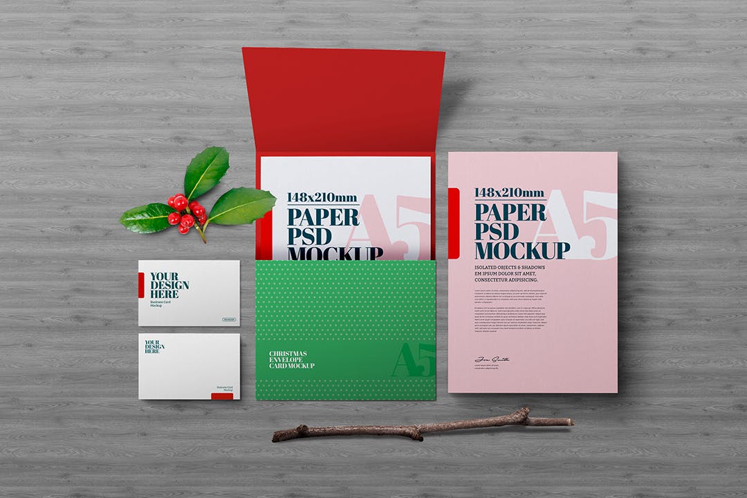 该圣诞节主题A5尺寸传单邀请贺卡样机将帮助您改善演示文稿或任何其他项目。在这里您可以找到高质量的图像,以高分辨率拍摄。所有对象、灯光和阴影都被单独分开。通过智能对象可以轻松编辑圣诞样机。它非常有用、优雅且易于应用。非常适合印刷和网页设计。用质量和美丽使您的顾客感到惊讶!