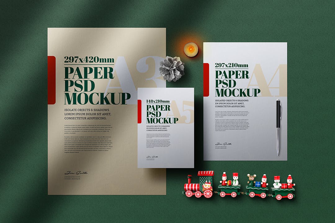 该圣诞文具A5/A4/A3尺寸传单海报样机将帮助您改善演示文稿或任何其他项目。在这里您可以找到高质量的图像,以高分辨率拍摄。所有对象、灯光和阴影都被单独分开。通过智能对象可以轻松编辑圣诞样机。它非常有用、优雅且易于应用。非常适合印刷和网页设计。用质量和美丽使您的顾客感到惊讶!