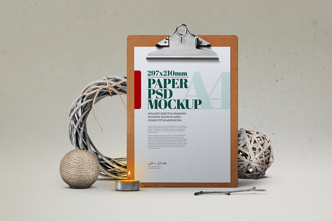 该圣诞场景A4尺寸海报剪贴板样机将帮助您改善演示文稿或任何其他项目。在这里您可以找到高质量的图像,以高分辨率拍摄。所有对象、灯光和阴影都被单独分开。通过智能对象可以轻松编辑圣诞样机。它非常有用、优雅且易于应用。非常适合印刷和网页设计。用质量和美丽使您的顾客感到惊讶!