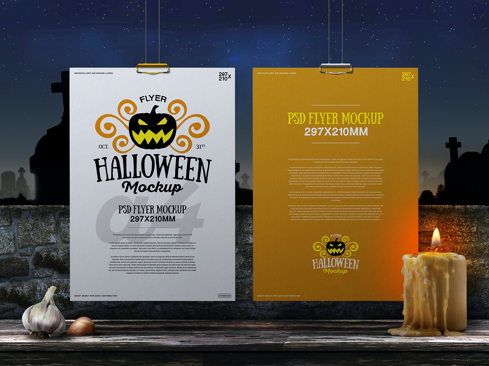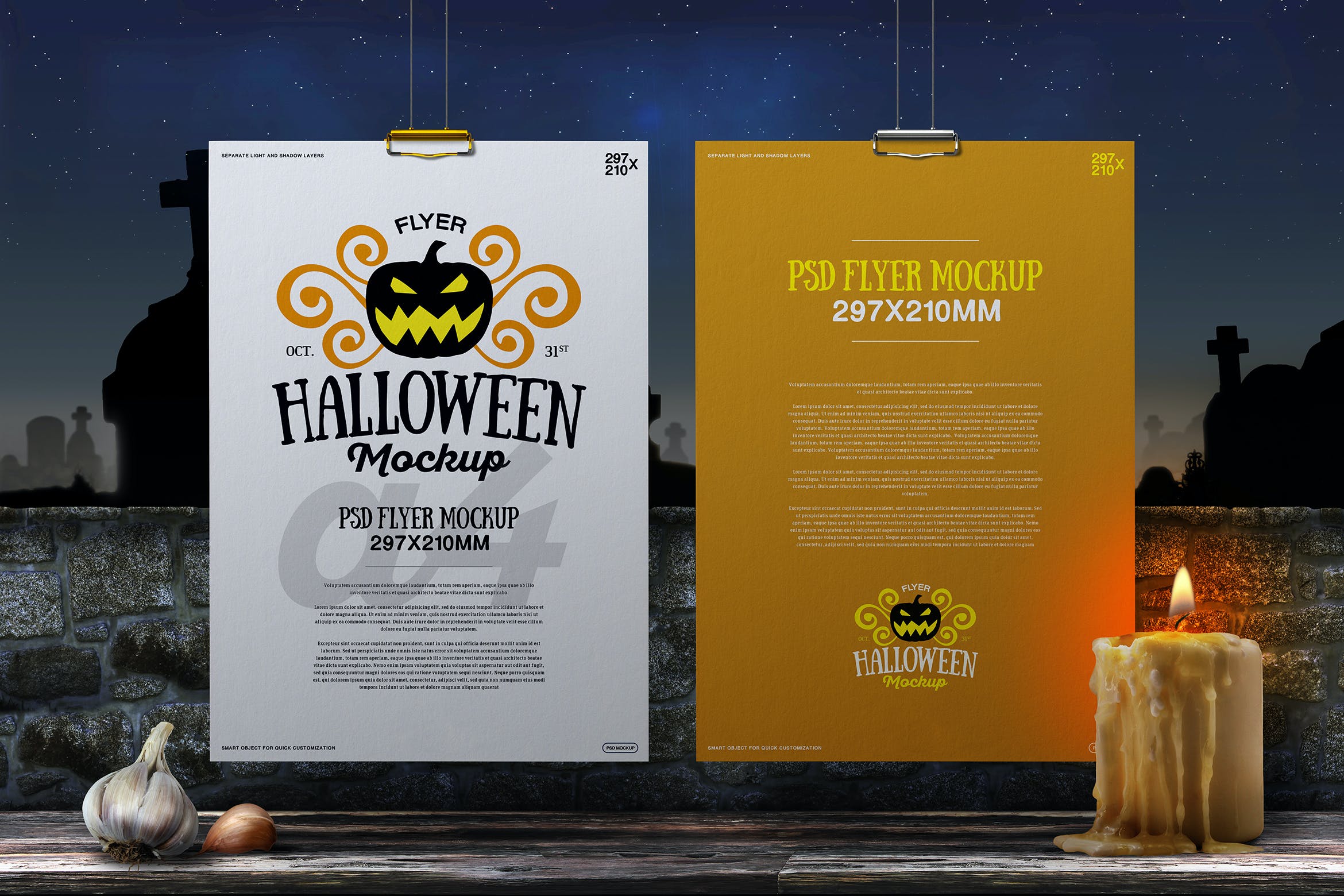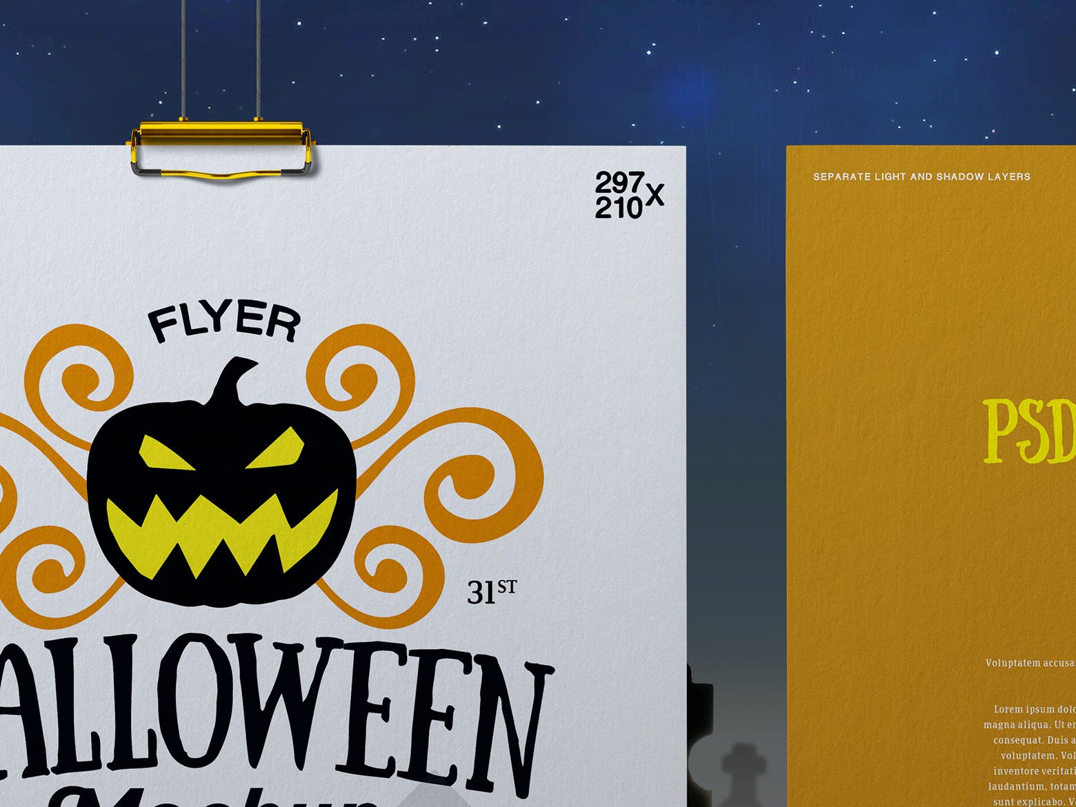 该高分辨率的吊挂A4尺寸万圣节传单/海报样机模板将帮助您改善演示文稿或任何其他项目。在这里您可以找到高质量的图像,以高分辨率拍摄。所有对象、灯光和阴影都单独分开。通过智能对象可以轻松编辑传单样机。它非常有用,优雅且易于应用。非常适合印刷和网页设计。用质量和美丽使您的顾客感到惊讶!