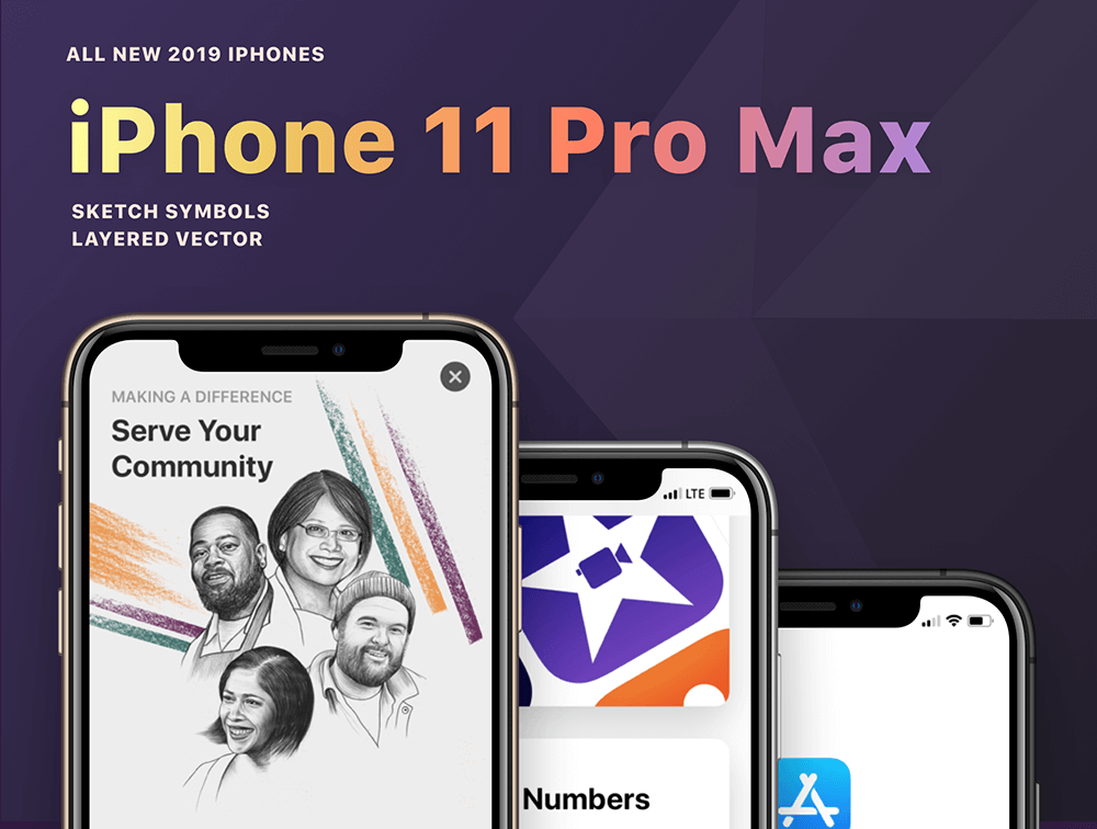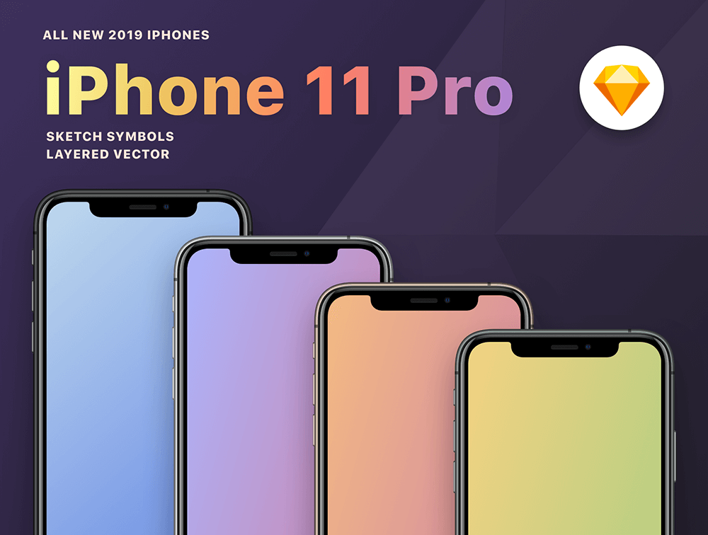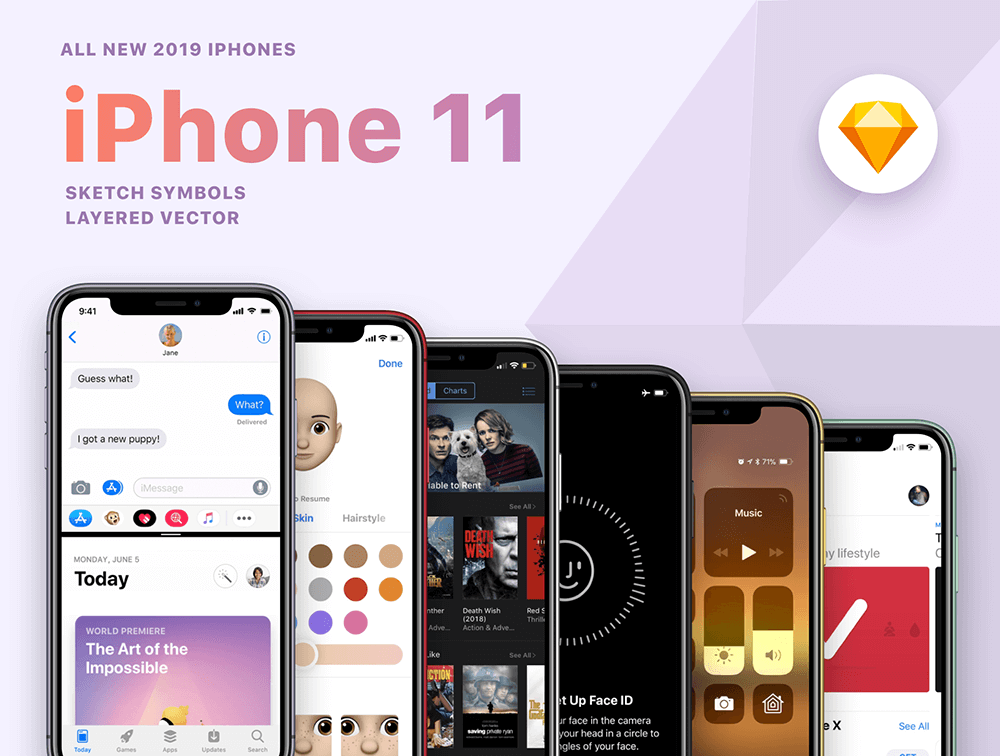 iPhone 11 Pro 和 11 Pro Max – 银色/金色/深空灰色/午夜绿和 iPhone 11 – 白色/黑色/紫色/黄色/绿色/红色。简单,只需更改 Sketch Symbols 中的图像即可更改 UI 图像!视网膜准备就绪。非常适合产品展示!