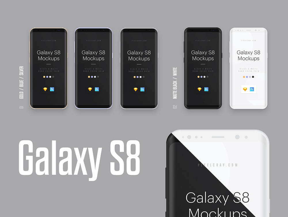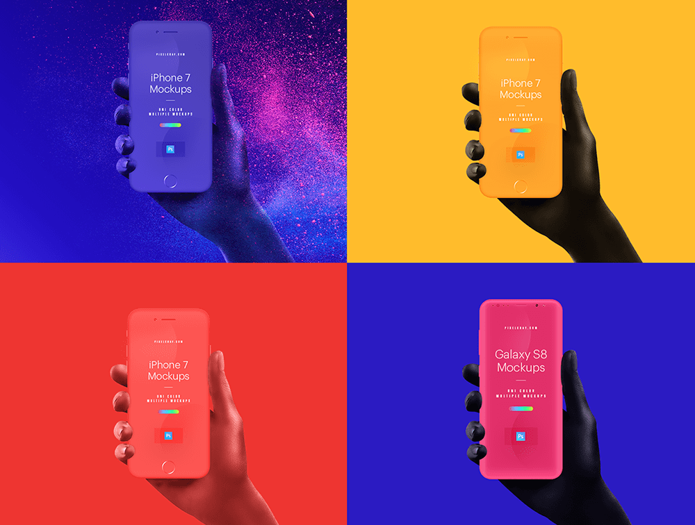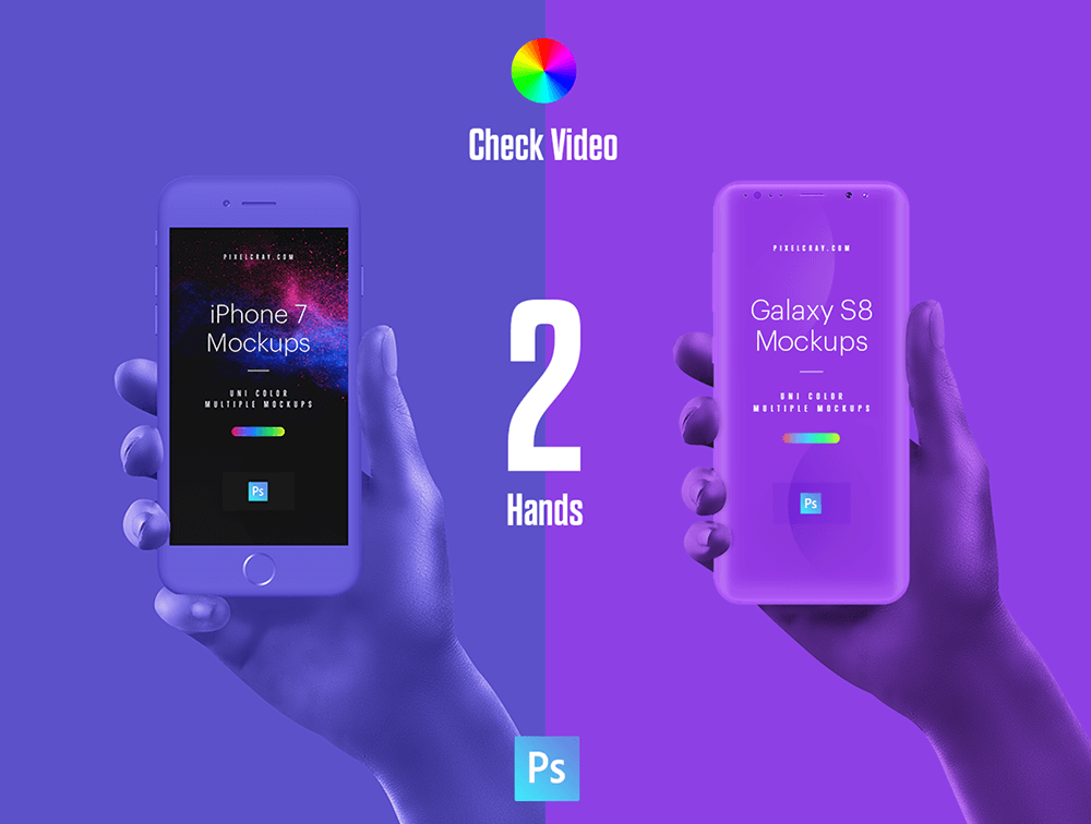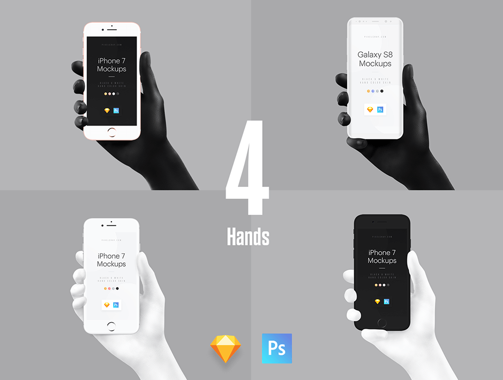 漂亮的单色和黑色/白色手样机套装。2 种不同的手部位置。高质量的模型为您的设计创建完美的演示。它有 iPhone 7、Galaxy S8的模型。单色模型与 Photoshop CS/CC 兼容。与 Sketch 和 Photoshop CS/CC 兼容的哑光黑白。