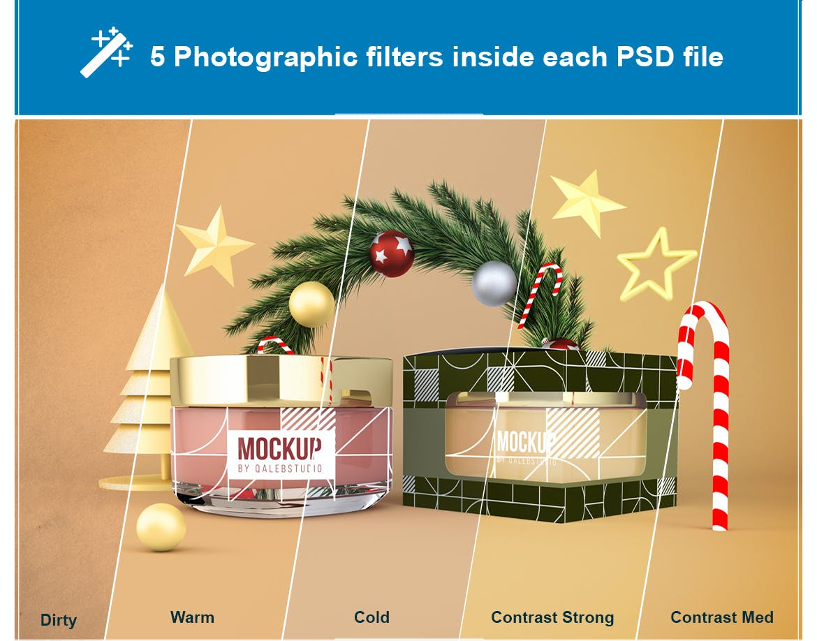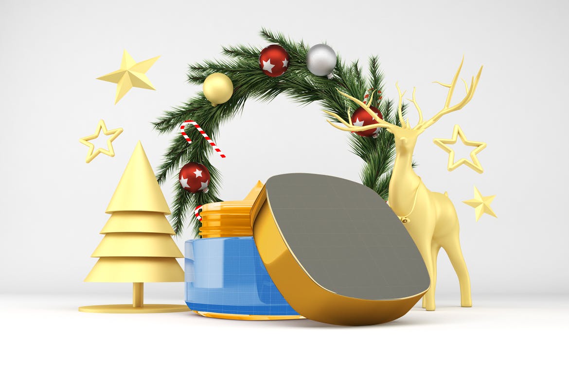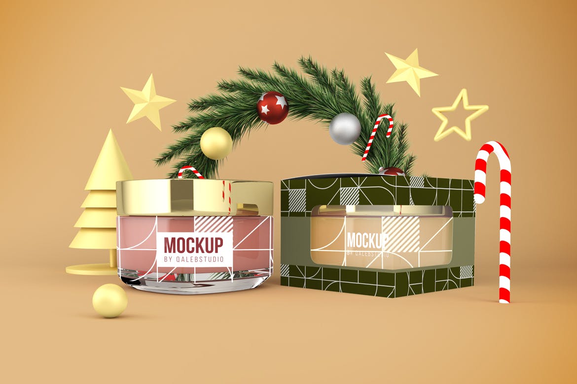 圣诞节元素乳液化妆品包装设计样机,可以从不同的角度在圣诞节主题背景中呈现化妆品,您可以将其用于您的设计,适用于品牌,并且由单独的图层组组成。易于与智能对象一起使用。