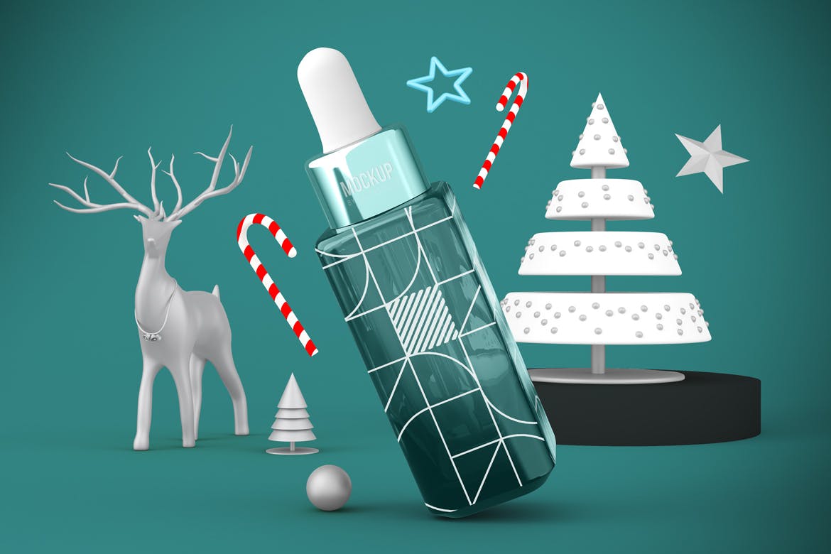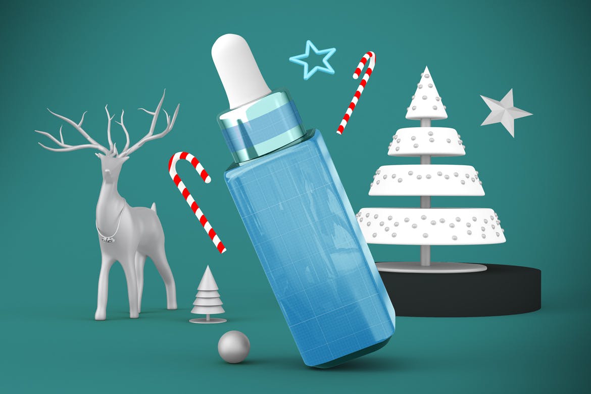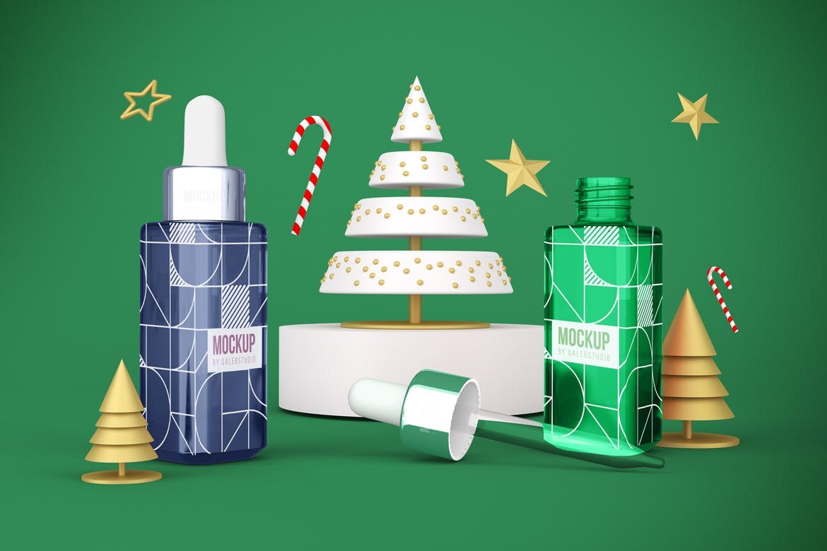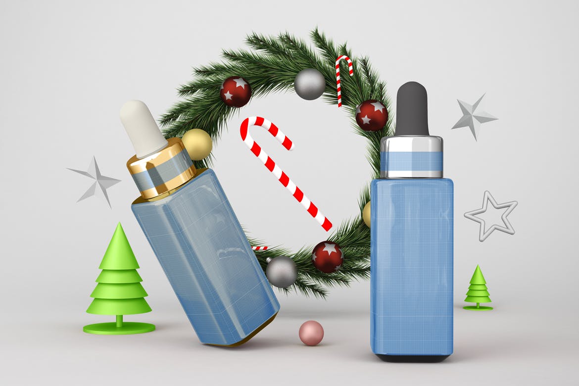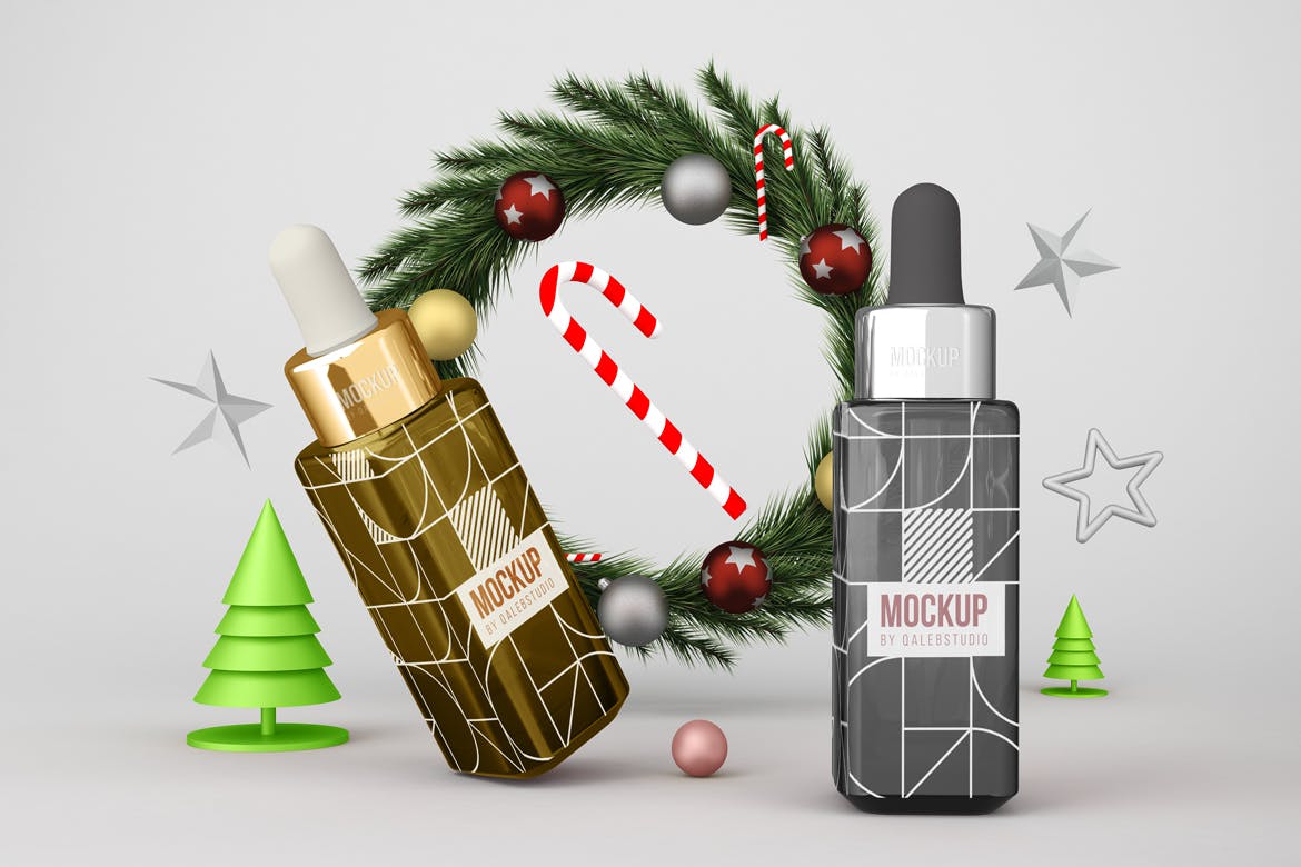 圣诞节滴管瓶包装设计样机,可以从不同的角度在圣诞节主题背景中展示滴管瓶,您可以将其用于您的设计,适合品牌,并且由单独的图层组组成。易于与智能对象一起使用。