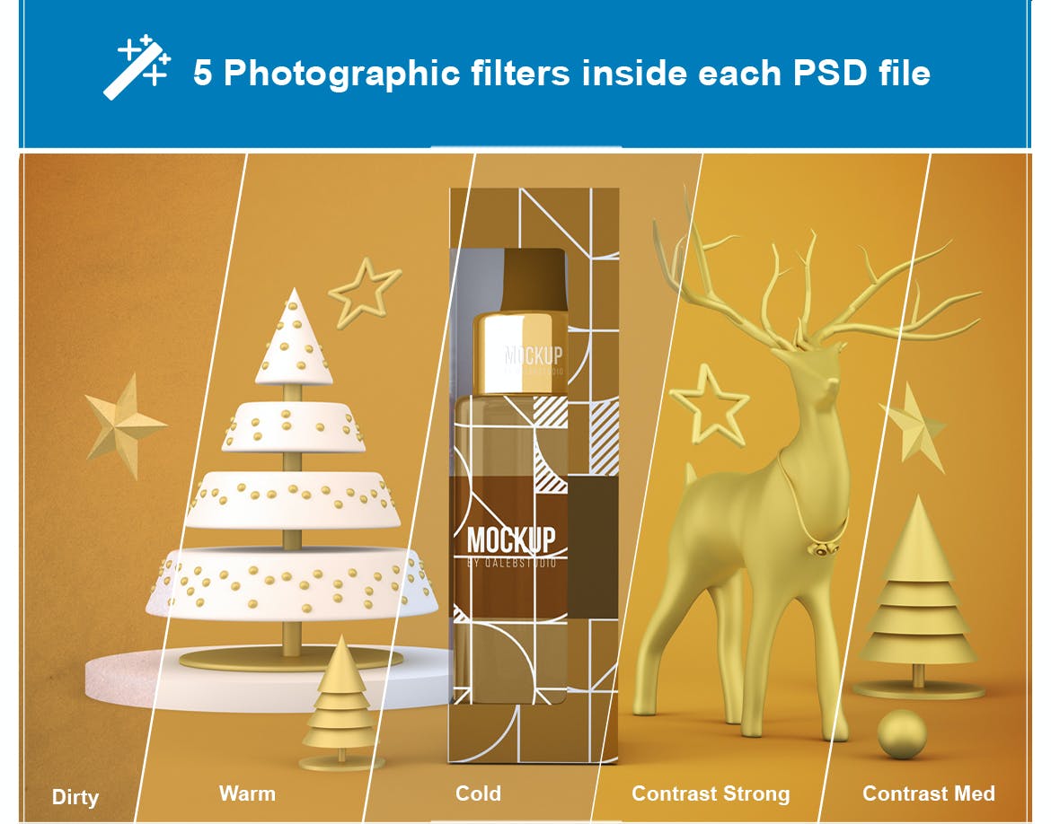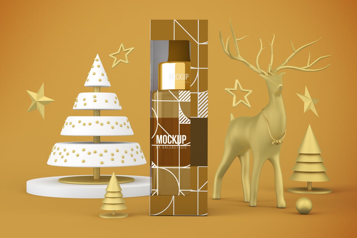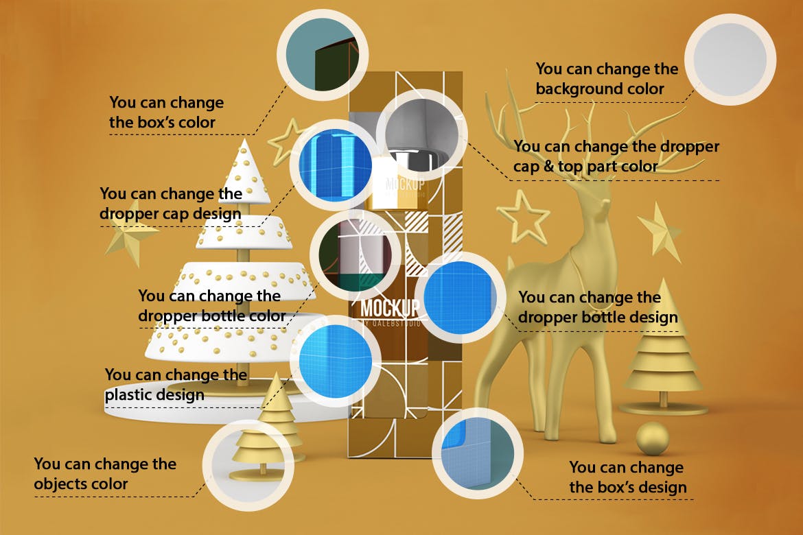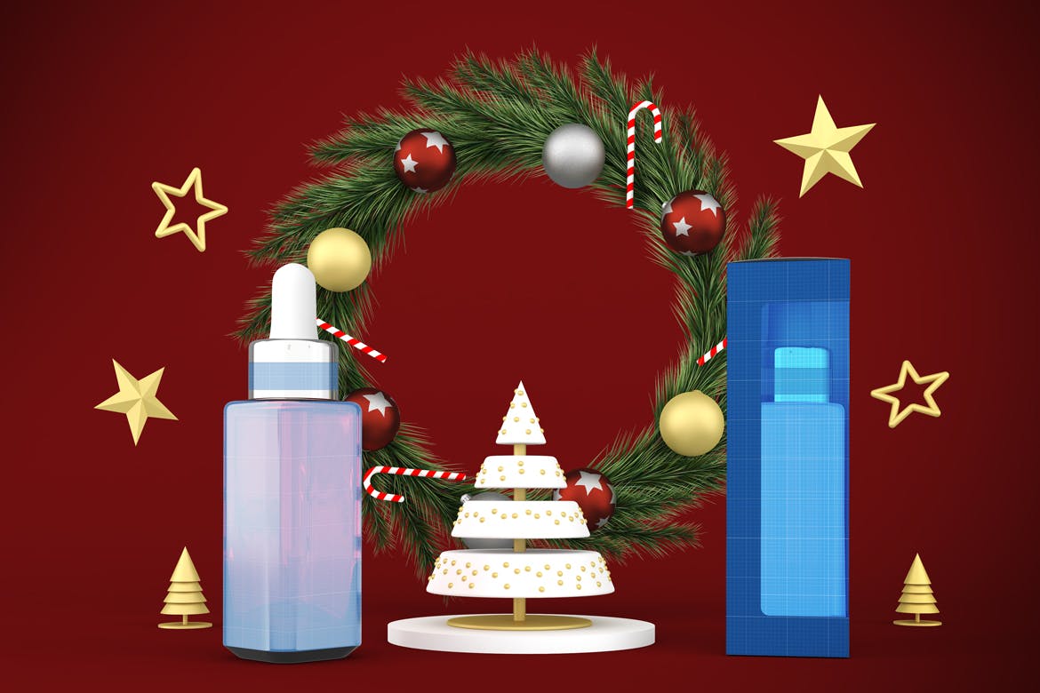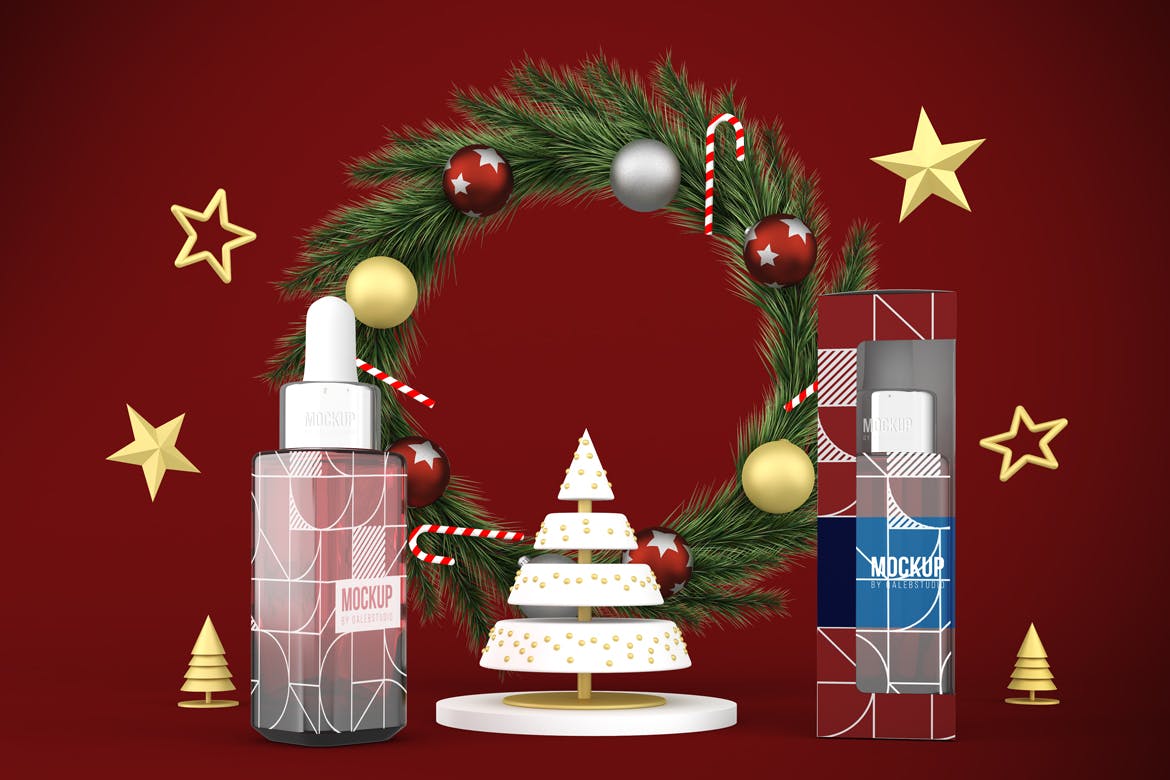圣诞节滴管瓶包装设计样机,可以从不同的角度在圣诞节主题背景中展示滴管瓶,您可以将其用于您的设计,适合品牌,并且由单独的图层组组成。易于与智能对象一起使用。