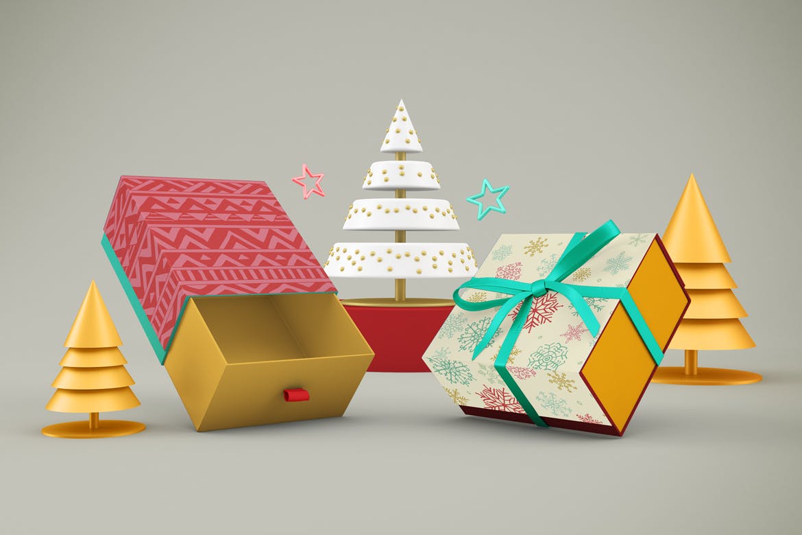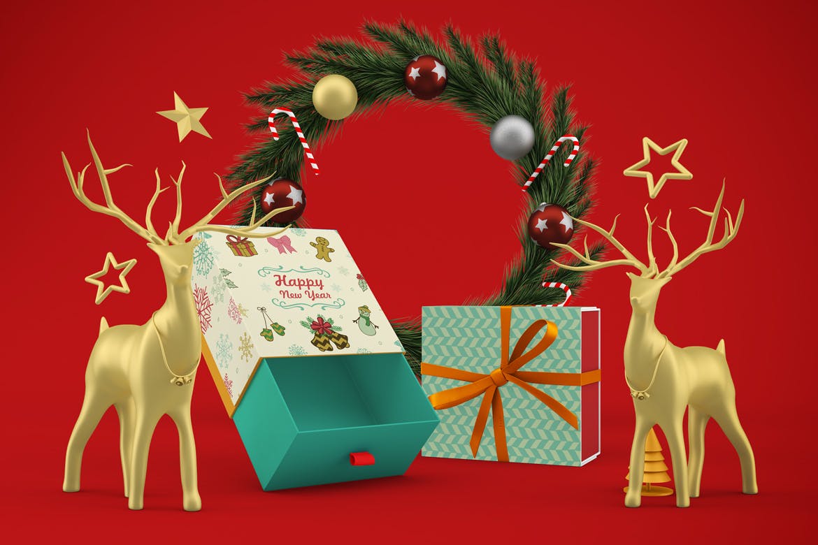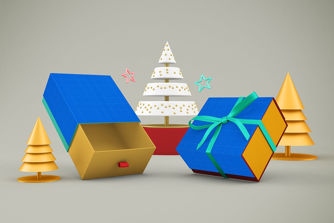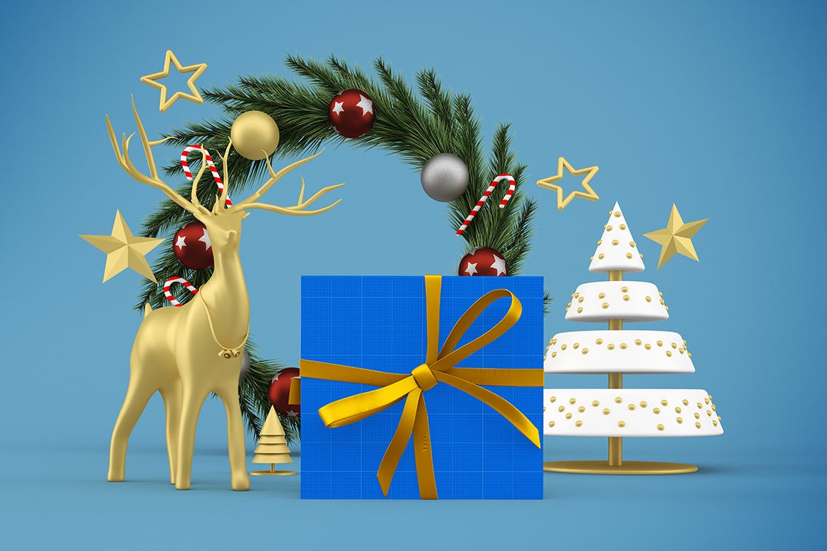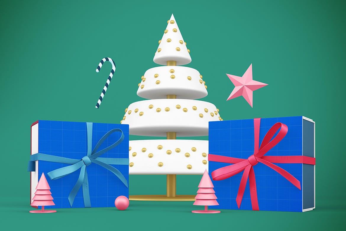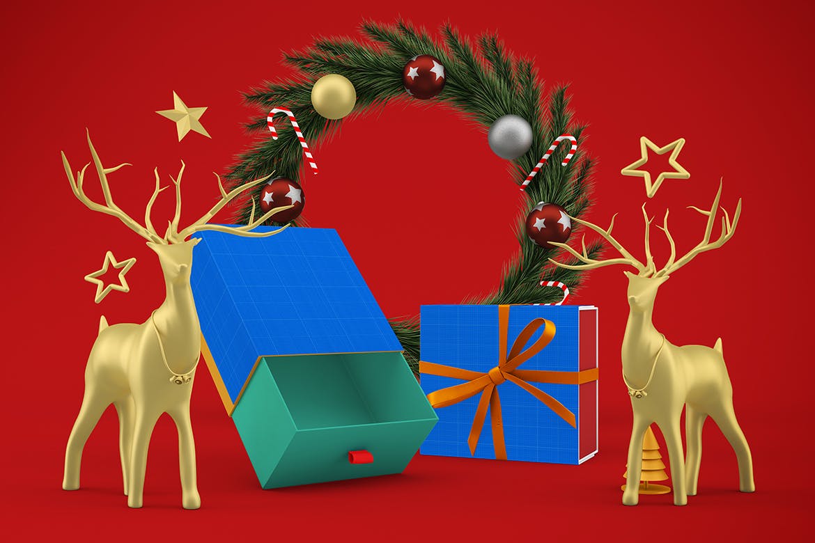 圣诞节礼物礼盒设计样机,可以从不同的角度在圣诞节主题背景中展示礼品盒,您可以将其用于您的设计,适合品牌,并且由单独的图层组组成。易于与智能对象一起使用。