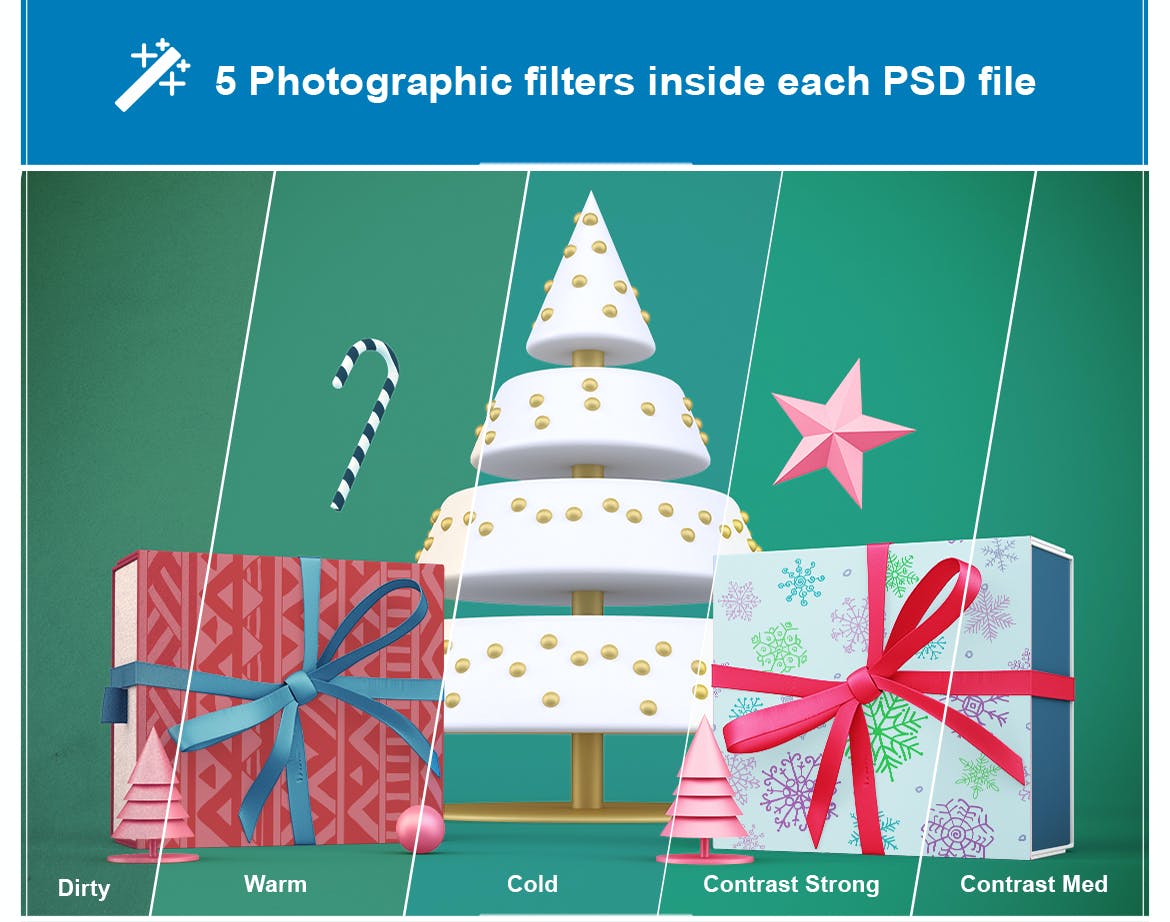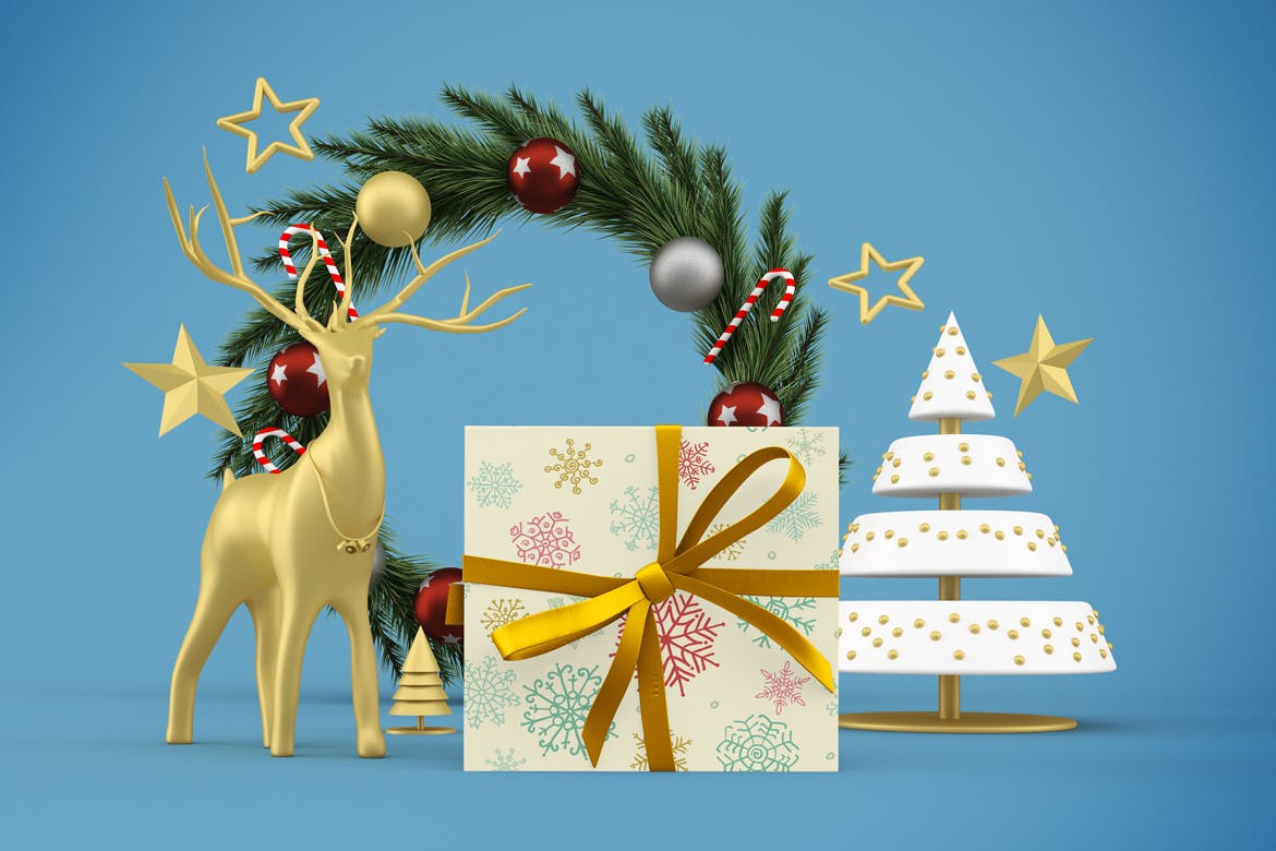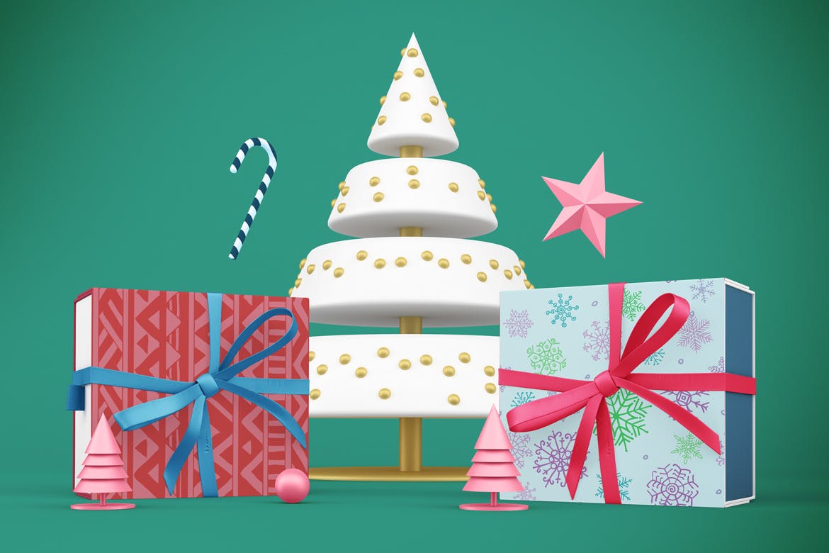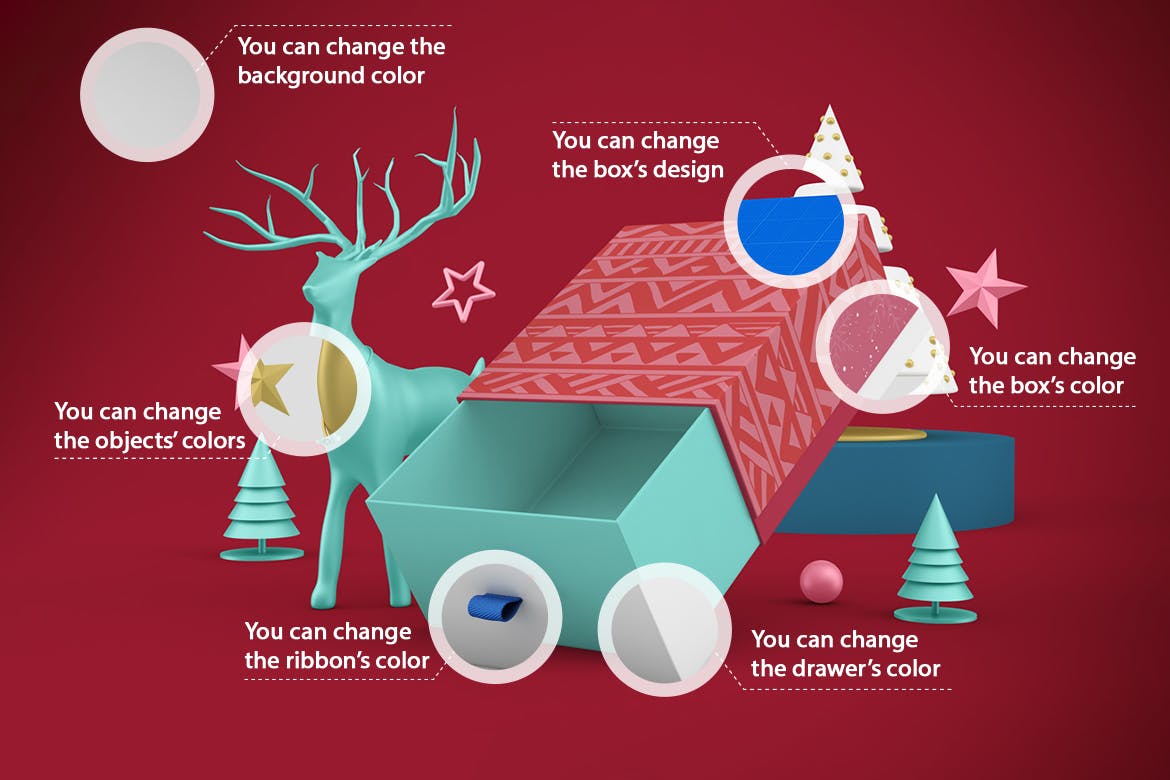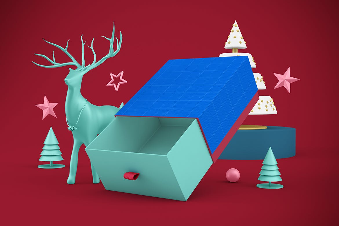 圣诞节礼物礼盒设计样机,可以从不同的角度在圣诞节主题背景中展示礼品盒,您可以将其用于您的设计,适合品牌,并且由单独的图层组组成。易于与智能对象一起使用。