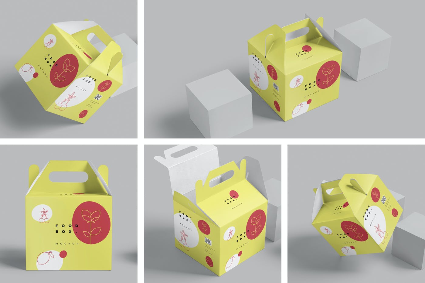 山墙盒子样机套装是展示您的食品外卖包装设计、餐厅和咖啡厅品牌设计的最佳盒子样机。这些纸质食品盒样机有 5 种不同的样式,可帮助您清楚地展示您的设计。在 Photoshop 中打开它,使用智能图层进行自定义并像专家一样呈现。