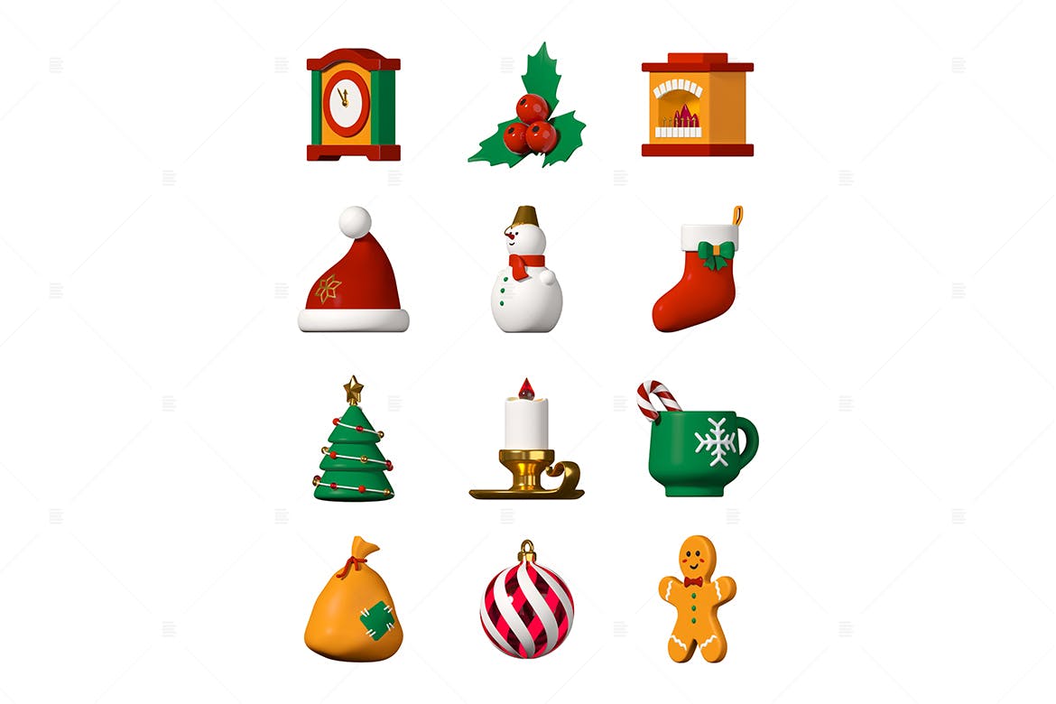 冬季假期图标 – 现代彩色3D图标集,新年和圣诞节的庆祝符号。姜饼人,甘蔗,时钟,装饰树,槲寄生,圣诞帽,袜子,球,壁炉。